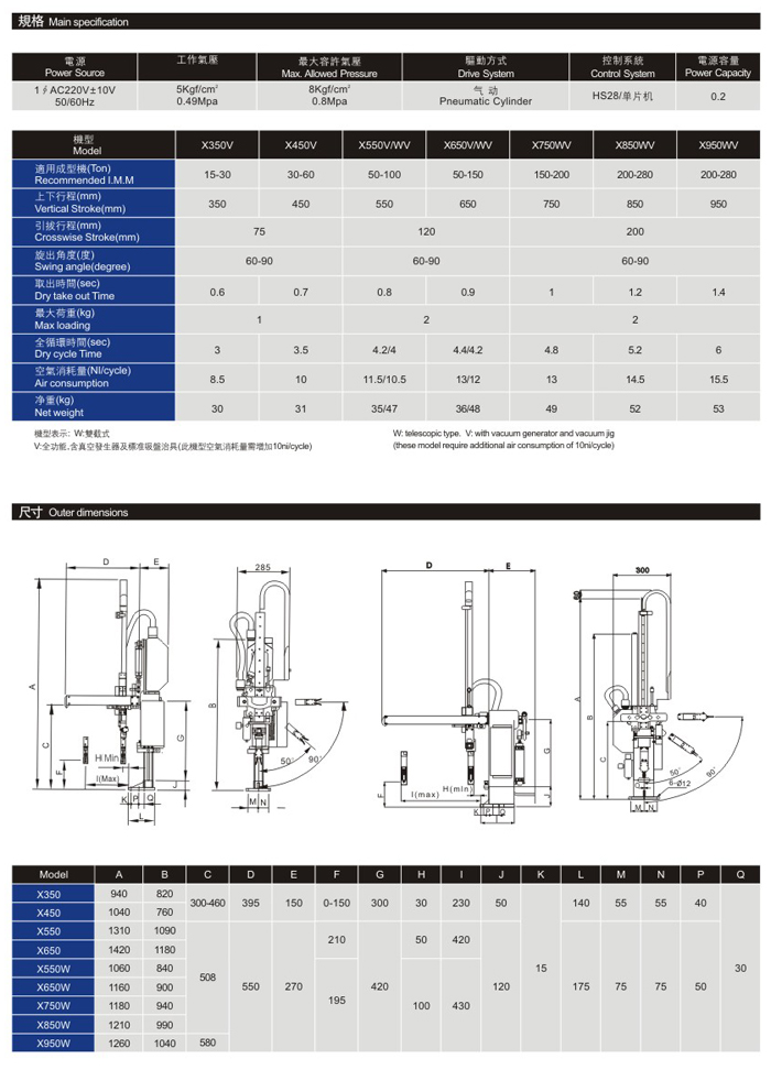 机型表示:W:双截式 W:telescopic type. V:with vacuum generator and vacuum jig